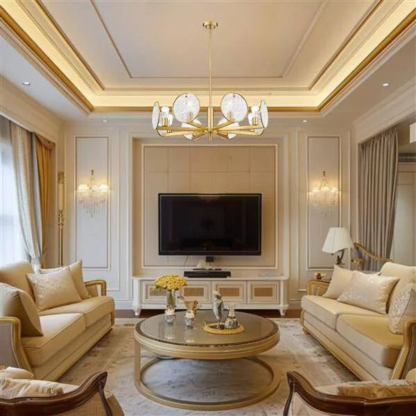 8 x E26 60Watt - Pendant - 42"L x 11"W x 11"H - Gold finish, 3 x 12" + 1 x 6" Rods, 18 Lbs