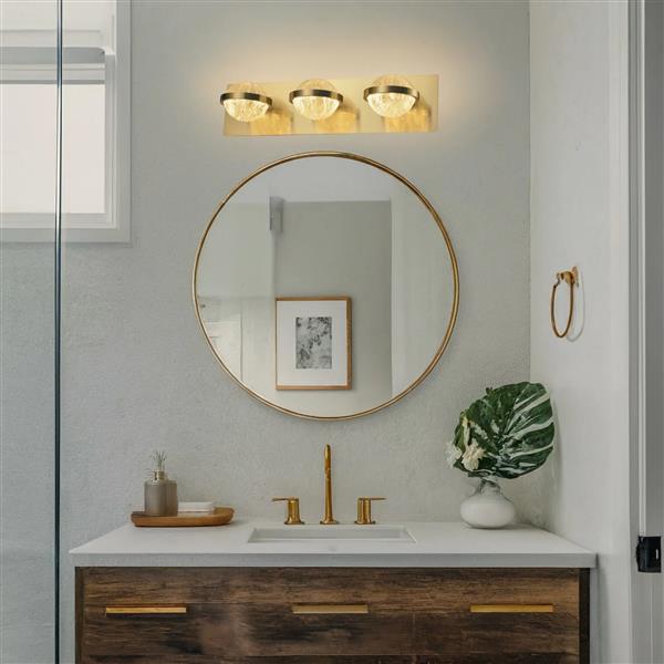 Illuminate your space with the modern LED Vanity Light, Item# SML429114-3-3K-GD. Featuring a luxurious gold plating finish, this fixture provides both style and energy efficiency with its integrated LED technology. Measuring 20"W x 6"D x 5"H, it’s perfect for bathrooms and vanities. The 3000K color temperature offers warm, inviting light with a brightness of 1,000 lumens. Rated for damp locations and CETL certified, it ensures safety and versatility. Compatible with various dimmers, this LED vanity light allows for customizable lighting to suit any mood or setting. Enhance your living spaces with this contemporary and elegant lighting solution.