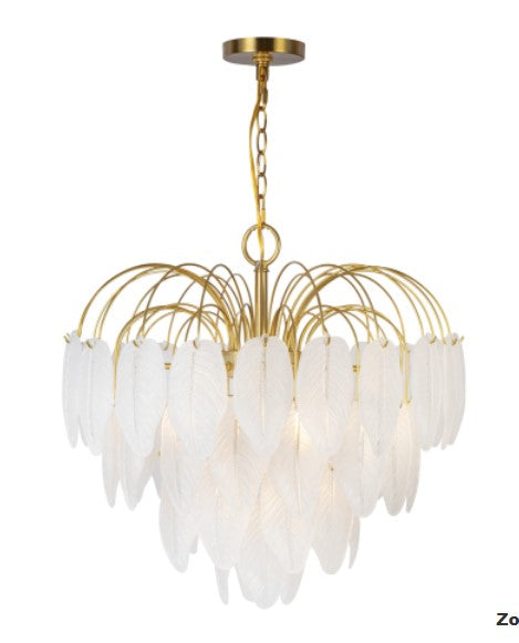 10 x E12 Bulbs - Chandelier - Brushed Brass Metal / White Galss - Dia 22.6" x H22.4" - Chain: 96" Adjustable - 7 Lbs